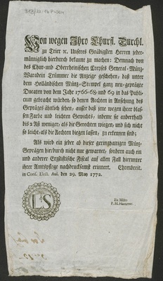 Von wegen Ihro Churfl. Durchl. zu Trier [et]c. Unseres Gnädigsten Herren jedermänniglich hierdurch bekannt zu machen: Demnach von des Chur- und Oberrheinischen Creyses General-Münz-Waradein Trümmer die Anzeige geschehen, daß unter dem Holländischen Münz-Stempel ganz neu-geprägte Ducaten von dem Jahr 1766-68- und 69 in das Publicum gebracht würden ... Ehrenbreit. in Cons. Elect. Aul. den 29. May 1772. / [Clemens Wenceslaus Churfürst]. Ex Mdto P. M. Hommer