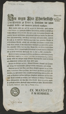 Von wegen Ihro Churfürstliche Durchlaucht zu Trier [et]c. sämtlichen des hohen Ertzstifts Städt- und Aemteren hierdurch anzufügen: Daß dieselbe nicht nur auf die wegen der Geburths-Hülf unterm 22ten Februar 1772. gnädigst erlaßener Verordnung, welche von höchst gedachter Seiner Churfürstl. Durchlaucht ihres ganzen Inhalts noch mahlen hiermit wiederholet .... Ehrenbreitstein in Consilio Electoraii Aulico den 9. Februar 1774. / [Clemens Wenceslaus Churfürst]. Ex Mandato P. M. Hommer
