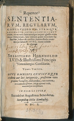 Repertorium Sententiarvm, Regvlarvm, Conclvsionvm, Itemqve Axiomatvm, Sive Locorvm Commvnium : ex universo Iuris utriusque corpore, glossis etiam atque interpretum, tam veterum quam recentium tractatibus, lecturis, & consiliis, summo studio, maximoque labore, & industria recens collectum & adornatum ; Opus Omnibus Cuiuscunque ordinis aut loci Iuris peritis, praesertim vero praxin forensem sectantibus, non tantum accommodatissimum, sed & apprime utile, maximeque necessarium ... / A Sebastiano Hornmoldi I.U.D. & Illustrissimi Principis Würtembergici Consiliario