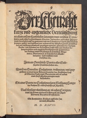 Der Lehenrecht kurtze vnd aygentliche Verteütschung: nit allain auß den kayserlichen Satzungen unnd derselben Texten, sonder auch vilen hochberümpten Doctorn ... / Durch ... Andreas Perneder ... mit vil arbait vnnd fleyß zůsam̃en getragen vnnd beschriben. Mit ainer Vorrede des Hochgelerten herrn Wolffgang Hunger