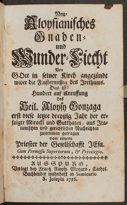 Neu-Aloysianisches Gnaden- und Wunder-Liecht : von Gott in seiner Kirch angezündt wider die Finsternussen des Irrthums. Das ist: Hundert auf Anruffung des Heil. Aloysy Gonzaga erst diese letzte dreyßig Jahr her erfolgte Mirackl und Gutthaten, aus Italienischen und gerichtlichen Nachrichten zusammen getragen ; von einem Priester der Gesellschaft Jesu