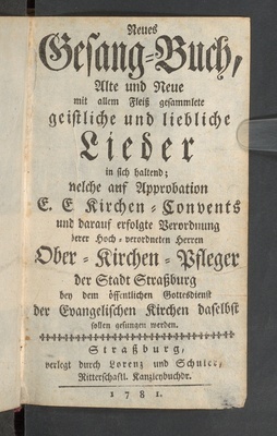 Neues Gesang-Buch, Alte und Neue mit allem Fleiß gesammlete geistliche und liebliche Lieder in sich haltend : welche auf Approbation E. E. Kirchen-Convents und darauf erfolgte Verordnung derer Hoch-verordneten Herren Ober-Kirchen-Pfleger der Stadt Straßburg bey dem öffentlichen Gottesdienst der evangelischen Kirchen daselbst sollen gesungen werden
