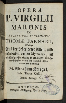 Opera P. Virgilii Maronis / Ex Recensione Potissimum Thomæ Farnabii, Welche Aus der Lehre derer Alten ... erkläret und an das Licht stellet M. Abraham Kriegel, Sch. Thom. Coll