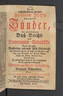 Der mit rechtschaffenem Hertzen Zu seinem Jesu sich nahende Sünder : In auserlesenen Buß- Beicht- und Communion-Andachten, Deren sich dessen Bußfertige und nach Jesu Liebesmahl sich sehnende Seele, so wohl zur Beichte, als auch zum Gebrauch des theuren Abendmahls des Herrn bedienen kan