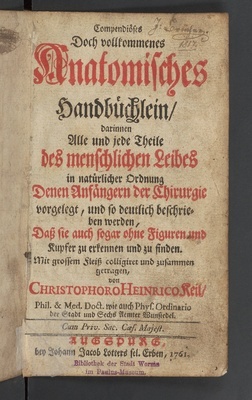 Compendiöses Doch vollkommenes Anatomisches Handbüchlein : darinnen Alle und jede Theile des menschlichen Leibes in natürlicher Ordnung Denen Anfängern der Chirurgie vorgelegt, und so deutlich beschrieben werden, Daß sie auch sogar ohne Figuren und Kupfer zu erkennen und zu finden / Mit grossem Fleiß colligiret und zusammen getragen, von Christophoro Heinrico Keil, Phil. & Med. Doct. wie auch Phys. Ordinario der Stadt und Sechs Aemter Wunsiedel.
