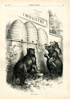 The tramp period : Bären versuchen aus Bienenkörben, welche die amerikanische Industrie darstellen, den Honig zu stehlen / Th. Nast