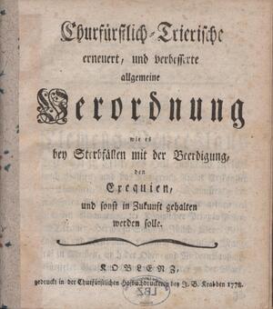 Churfürstlich-Trierische erneuert, und verbesserte allgemeine Verordnung wie es bey Sterbfällen mit der Beerdigung, den Exequien, und sonst in Zukunft gehalten werden solle / [Clemens Wenceslaus Churfürst]