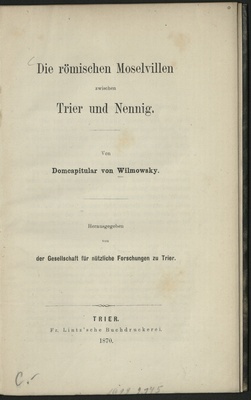 Die römischen Moselvillen zwischen Trier und Nennig / von von Wilmowsky. Hrsg. von der Gesellschaft für mützliche Forschungen zu Trier