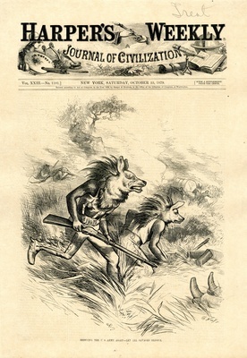 Reducing the U.S. Army again - let all savages rejoice : Indianer, die als Hyänen dargestellt werden, machen Jagd auf weiße Siedler und Soldaten / Th. Nast