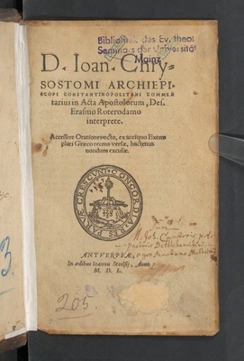 D. Ioan. Chrysostomi Archiepiscopi Constantinopolitani Commentarius in Acta Apostolorum / Des. Erasmo Roterdamo interprete