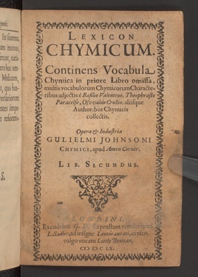 Lexicon Chymicum. : Continens Vocabula Chymica in priore Libro omissa, multis vocabulorum Chymicorum Characteribus adiectis è Basilio Valentino, Theophrasto Paracelso, Os[w]aldo Crollio, aliisque Authoribus Chymicis collectis.; Lib. Secundus / Opera [et] Industria Gulielmi Johnsoni Chymici, apud Amen Corner.