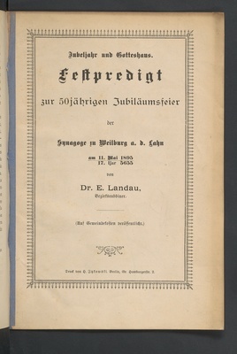 Jubeljahr und Gotteshaus. Festpredigt zur 50jährigen Jubiläumsfeier der Synagoge zu Weilburg a. d. Lahn am 11. Mai 1895 (17. Ijar 5655) / von Dr. E. Landau, Bezirksrabbiner