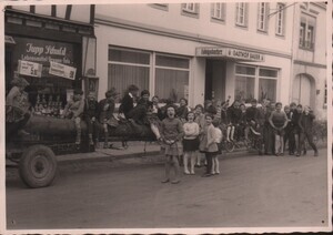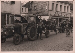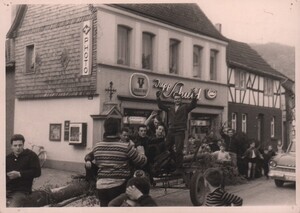 Junggesellen mit dem Maibaum vor dem Lebensmittelgeschäft Jupp Schuld auf dem Weg zum Aufstellplatz