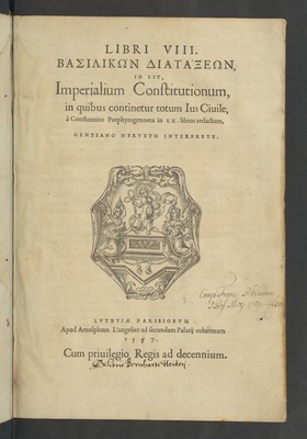 Libri VIII. Basilikōn diataxeōn, id est, imperialium constitutionum, in quibus continentur totum ius civile / a Constantino Porphyrogenneta in LX libros redactum, Gentiano Herveto interprete