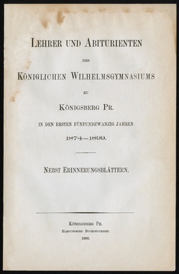 Lehrer und Abiturienten des Königlichen Wilhelmsgymnasiums zu Königsberg Pr. in den ersten fünfundzwanzig Jahren : 1874-1899 ; nebst Erinnerungsblättern