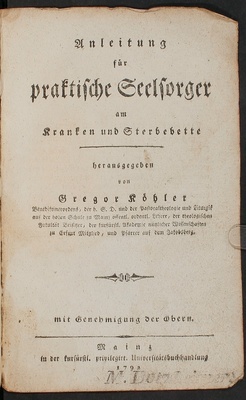 Anleitung für praktische Seelsorger am Kranken und Sterbebette / herausgegeben von Gregor Köhler, Benediktinerordens, der h. S. D. und der Pastoraltheologie und Liturgik auf der hohen Schule zu Mainz öffentl. ordentl. Lehrer, der theologischen Fakultät Beisitzer, der kurfürstl. Akademie nützlicher Wissenschaften zu Erfurt Mitglied, und Pfarrer auf dem Jakobsberg