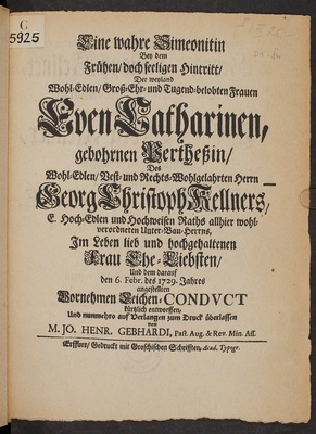 Eine wahre Simeonitin Bey dem Frühen, doch seeligen Hintritt, Der weyland Wohl-Edlen, Groß-Ehr- und Tugend-belobten Frauen Even Katharinen, gebohrnen Perthesin, Des Wohl-Edlen, Best- und Rechts-Wohlgelahrten Herrn Georg Christoph Kellners, E. Hoch-Edlen und Hochweisen Raths allhier wohl-verordneten Unter-Bau-Herrns, Im Leben lieb und hochgehaltenen Frau Ehe-Liebsten, Und dem darauf den 6. Febr. des 1729. Jahres angestellten Vornehmen Leichen-Condvct / kürzlich entworffen, Und nunmehro Auf Verlangen zum Druck überlassen von M. Jo. Henr. Gebhardi, Past. Aug. & Rev. Min. Ass.