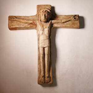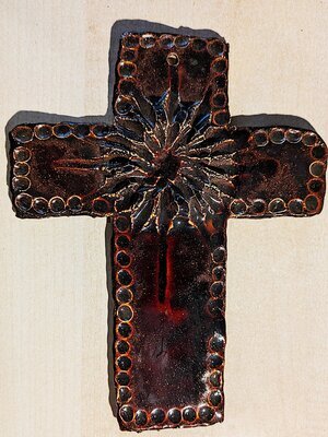 Rotes Keramik Standkreuz mit Weihwasserbecken