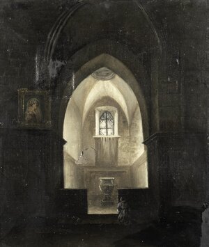 Kircheninterieur: Kapelle mit Taufstein in dunkler Kirche