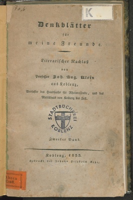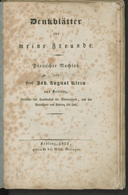 Denkblätter für meine Freunde - Poetischer Nachlass / von Joh. August Klein