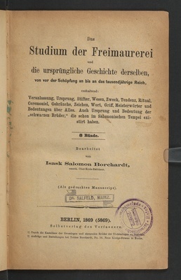 Das Studium der Freimaurerei und die ursprüngliche Geschichte derselben, von vor der Schöpfung an bis an das tausendjährige Reich / bearbeitet von Isaak Salomon Borchardt (eremit. Ober-Kreis-Rabbiner)
