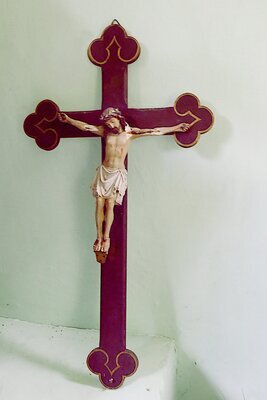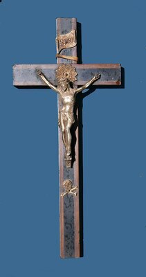 Sterbekreuz (Metallkreuz auf Holzkreuz)