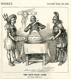 The New-Year cake. Let them ha(l)ve it : Uncle Sam teilt einen Kuchen in Form eines Geldsacks auf. Marineminister Whitney und Kriegsminister Endicott, in der Gestalt von Poseidon und Mars, warten darauf, ein Stück zu bekommen / Th. Nast