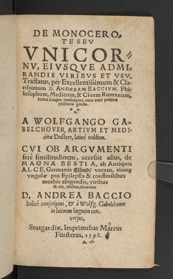 De monocerote seu unicornu eiusque admirandis viribus et usu, tractatus Andrea Bacci. Italia lingua conscriptus, nunc. a Wolfgango Gabelckover. Latine redditus cui ob argumenti fere similitudinem, accessit alius, de Magna Bestia, ab Antiquis Alce, Germanis Ellend, vocato ... ab eodem Andr. Baccio Italice conscr., et a Wolfg. Gabelchover in latinam linguam conversus