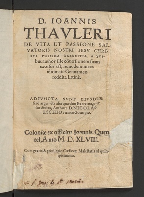D. Joanis Thauleri de vita et passione salvatoris nostri Jesu Christi piissima exorcitia ... : adiuncta sunt eiusdem ferè argumenti alia quaedam exercitia ...
