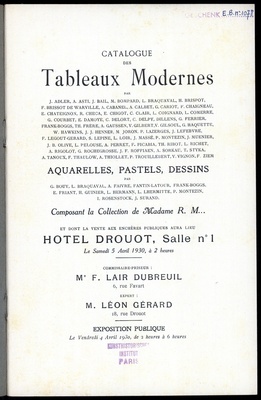 Catalogue des tableaux modernes : par J. Adler, A. Asti, J. Bail, M. Bompard, L. Braquaval, H. Brispot [und weiteren] : aquarelles, pastels, dessins : par G. Bouy, L. Braquaval, A. Faivre, Fantin-Latour, Frank-Boggs [und weiteren] : composant la Collection de Madame R. M... : et dont la vente aux enchères publiques aura lieu Hôtel Drouot, Salle No 1, le samedi 5 avril 1930 / commissaire-priseur F. Lair Dubreuil ; expert Léon Gérard