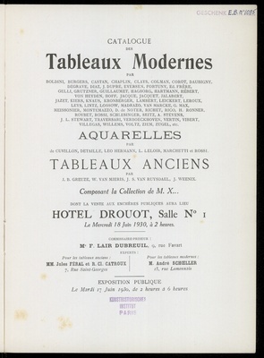 Catalogue des tableaux modernes : par Boldini, Burgers, Castan, Chaplin, Clays, Colman, Corot, Daubigny [und weiteren] : aquarelles de Cuvillon, Detaille, Leo Hermann, L. Leloir, Marchetti et Rossi : tableaux anciens par J. B. Greuze, W. van Mieris, J. S. van Ruysdael, J. Weenix : composant la Collection de M. X... : dont la vente aux enchères publiques aura lieu Hôtel Drouot, Salle No 1, le mercredi 18 juin 1930 / commissaire-priseur: F. Lair Dubreuil ; experts pour les tableaux anciens Jules Féral et R.-Cl. Catroux, pour les tableaux modernes André Schœller