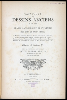 Catalogue des dessins anciens : œuvres de grands maîtres des XVe et XVIe siècles et des XVIIe et XVIIIe siècles : par Boissieu, Caresme, Deshays, Doomer, Fragonad, van Goyen [und weiteren] : composant la Collection de Madame X... : et dont aura lieu à Paris, Hôtel Drouot, Salle No 10, le mercredi 23 mai 1928 / commissaire-priseur: F. Lair Dubreuil ; experts Louis Godefroy, Lucien Huteau