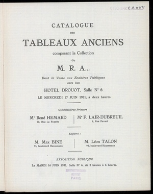 Catalogue des tableaux anciens : composant la Collection de M. R .A... : dont la vente aux enchères publiques aura lieu Hôtel Drouot, Salle No 6, le mercredi 17 juin 1931 / commissaires-priseurs René Hémard, F. Lair Dubreuil ; experts Max Bine, Léon Talon