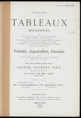 Catalogue des tableaux modernes : par Bail, Rosa Bonheur, E. Boudin, Bouguereau [und weitere] : pastels, aquarelles, dessins : par Mary Cassatt, Ed. Degas, Ed. Detaille, Helleu, Lhermitte, Ed. Manet : dont la vente aux enchères publiques aura lieu Galerie Georges Petit, 8, rue de Sèze, le jeudi 22 mai 1919 / commissaire-priseur F. Lair-Dubreuil ; expert Georges Petit