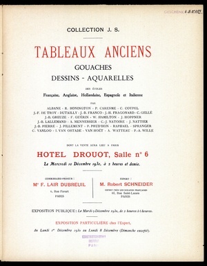 Tableaux anciens : gouaches, dessins, aquarelles : des Écoles française, anglaise, hollandaise, espagnole et italienne : par Albane, R. Bonington, P. Caresme, C, Coypel [und weiteren] : Collection J. S. : dont la vente aura lieu à Paris, Hôtel Drouot, Salle No 6, le mercredi 10 décembre 1930 / commissaire-priseur: F. Lair Dubreuil ; expert Robert Schneider