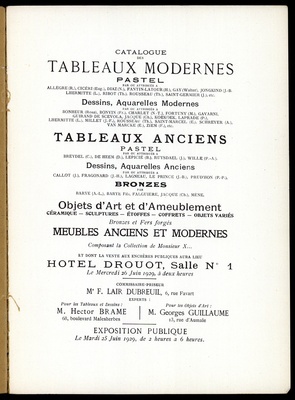 Catalogue des tableaux modernes : pastel : par ou attribués à Allègre (R.), Cicéri (Eug.), Diaz (N.), Fantin-Latour (H.), Gay (Walter) [und weitere] : dessins, aquarelles modernes : par ou attribués à Bonheur (Rosa), Bonvin (Fr.), Charlet (N.-T.), Fortuny (M.), Gavarni [und weitere] : tableaux anciens : pastel : par ou attribués à Breydel (C.), de Heem (D.), Lepicié (B.), Ruysdael (J.), Wille (P.-A.) : dessins, aquarelles anciens : par ou attribués à Callot (J.), Fragonard (J.-H.), Lagneau, Le Prince (J.-B.), Prud'hon (P.-P.) : bronzes par Barye (A.-L.), Barye Fils, Falguière, Jacque (Ch.), Mène : objets d'art et d'ameublement : céramique, sculptures, étoffes, coffrets, objets variés : bronzes et fers forgés : meubles anciens et modernes : composant la Collection de Monsieur X... : et dont la vente aux enchères publiques aura lieu Hôtel Drouot, Salle No 1, le mercredi 26 juin 1929 / commissaire-priseur: F. Lair Dubreuil ; experts pour les tableaux et dessins: Hector Brame, pour les objets d'art Georges Guillaume