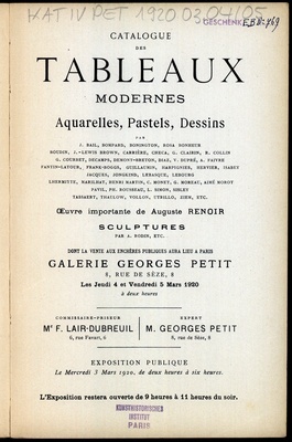 Catalogue des tableaux modernes : aquarelles, pastels, dessins : par J. Bail, Bompard, Bonington, Rosa Boenheur [und weiteren] : œuvre importante de Auguste Renoir : sculptures par A. Rodin, etc. : dont la vente aux enchères publiques aura lieu à Paris, Galerie Georges Petit, 8, rue de Sèze, les jeudi 4 et vendredi 5 mars 1920 / commissaire-priseur F. Lair-Dubreuil ; expert Georges Petit