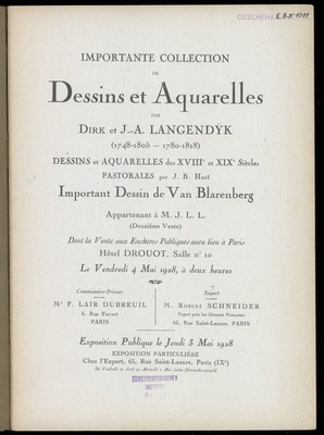 Importante collection de dessins et aquarelles : par Dirk et J.-A. Langendyk (1748-1805 - 1780-1818) : dessins et aquarelles des XVIIIe et XIXe siècles : pastorales par J.B. Huet : important dessin de Van Blarenberg : appartenant à M.J.L.L. (deuxième vente) : dont la vente aux enchères publiques aura lieu à Paris, Hôtel Drouot, Salle No 10, le vendredi 4 mai 1928 / commissaire-priseur: F. Lair Dubreuil ; expert Robert Schneider