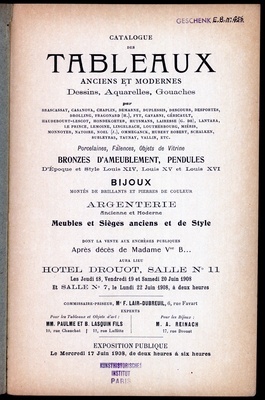 Catalogue des tableaux anciens et modernes : dessins, aquarelles, gouaches : par Brascassat, Casanova, Chaplin, Demarne, Duplessis, Descours, Desportes [und weiteren] : porcelaines, faïences, objets de vitrine : bronzes d'ameublement, pendules d'époque et style Louis XIV, Louis XV et Louis XVI : bijoux : montés de brillants et pierres de couleur : argenterie ancienne et moderne : meubles et sièges anciens et de style : dont la vente aux enchères publiques après décès de Madame Vve B... aura lieu Hôtel Drouot, Salle No 11, les jeudi 18, vendredi 19 et samedi 20 juin 1908 / commissaire-priseur F. Lair Dubreuil ; experts pour les tableaux et objets d'art: M. Paulme et B. Lasquin Fils, pour les bijoux: A. Reinach