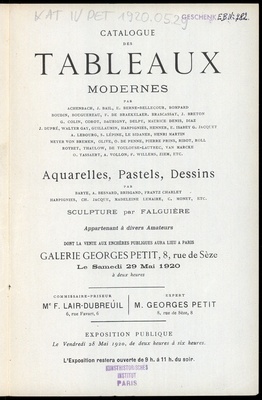 Catalogue des tableaux modernes : par Achenbach, J. Bail, E. Berne-Bellecour, Bompard [und weiteren] : aquarelles, pastels, dessins : par Barye, A. Besnard, Brisgand, Frantz Charlet [und weiteren] : sculptures par Falguière : appartenant à divers amateurs : dont la vente aux enchères publiques aura lieu à Paris, Galerie Georges Petit, 8, rue de Sèze, le samedi 29 mai 1920 / commissaire-priseur F. Lair-Dubreuil ; expert Georges Petit