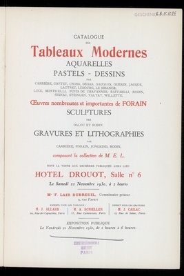 Catalogue des tableaux modernes : aquarelles, pastels, dessins : par Carrière, Cottet, Cross, Degas, Gauguin, Guérin, Jacque [und weiteren] : œuvres nombreuses et importantes de Forain : sculptures par Dalou et Rodin : gravures et lithographies par Carrière, Forain, Jongkind, Rodin : composant la Collection de M. E. L. : dont la vente aux enchères publiques aura lieu Hôtel Drouot, Salle No 6, le samedi 22 novembre 1930 / F. Lair Dubreuil, commissaire-priseur ; experts pour les tableaux J. Allard, A. Schœller, expert pour les gravures J. Cailac