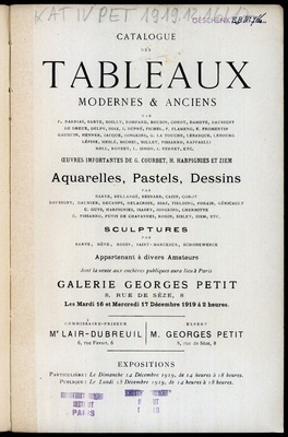Catalogue des tableaux modernes & anciens : par F. Barrias, Barye, Boilly, Bompard, Boudin, Corot, Damoye, Daubigny [und weiteren] : œuvres importantes de G. Courbet, H. Harpignies et Ziem : aquarelles, pastels, dessins : par Barye, Bellangé, Besnard, Cazin, Corot [und weiteren] : sculptures par Barye, Mène, Rodin, Saint-Marceaux, Schœnewerck : appartenant à divers amateurs : dont la vente aux enchères publiques aura lieu à Paris, Galerie Georges Petit, 8, rue de Sèze, les mardi 16 et mercredi 17 décembre 1919 / commissaire-priseur F. Lair-Dubreuil ; expert Georges Petit