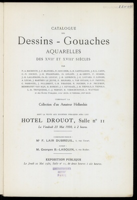 Catalogue des dessins - gouaches : des XVIIe et XVIIIe siècles : par P.-A. Baudouin, J.-F. Blondel , Fr. Boucher, G.-B. Castiglione, J.-B.-L. Cazin [und weiteren] : composant la Collection d'un Amateur hollandais : dont la vente aux enchères publiques aura lieu Hôtel Drouot, Salle No 11, le vendredi 23 mai 1930 / commissaire-priseur: F. Lair Dubreuil ; expert Georges-B. Lasquin