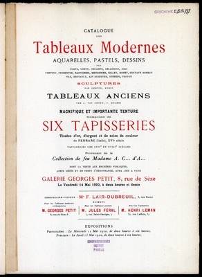 Catalogue des tableaux modernes : aquarelles, pastels, dessins : par Clays, Corot, Decamps, Delacroix, Diaz [und weiteren] : sculptures par Gemito, Rodin : tableaux anciens par J. van Goyen, F. Guardi : magnifique et importante tenture : composé de six tapisseries : tissées d'or, d'argent et de soies de couleur de Ferrare (Italie), XVIe siècle : tapisseries des XVIIe et XVIIIe siècles : provenant de la Collection de feu Madame A. C... d'A... : dont la vente aux enchères publiques après décès et en vertu d'ordonnance aura lieu à Paris, Galerie Georges Petit, 8, rue de Sèze, le vendredi 14 mai 1920 / commissaire-priseur F. Lair-Dubreuil ; experts pour les tableaux modernes et sculptures Georges Petit, pour les tableaux anciens Jules Féral, pour les tapisseries Henri Leman