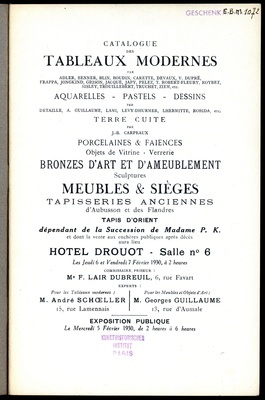 Catalogue des tableaux modernes : par Adler, Benner, Blin, Boudin, Carette, Devaux, V. Durpré [und weiteren] : aquarelles, pastels, dessins : par Detaille, A. Guillaume, Lami, Levy-Dhurmer, Lhermitte, Robida, etc. : terre cuite par J.-B. Carpeaux : porcelaines & faïences : objets de vitrine, vererie : bronzes d'art et d'ameublement : sculptures : meubles et sièges : tapisseries anciennes d'Aubusson et des Flandres : tapis d'Orient : dépendant de la succession de Madame P. K. : et dont la vente aux enchères publiques après décès aura lieu Hôtel Drouot, Salle No 6, les jeudi 6 et vendredi 7 février 1930 / commissaire-priseur F. Lair Dubreuil ; experts pour les tableaux modernes André Schœller, pour les meubles et objets d'art Georges Guillaume