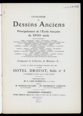 Catalogue des dessins anciens : principalement de l'École française du XVIIIe siècle : par ou attribués à Aubry, Bachelier, Binet, de Boissieu, Boucher, Casanova, Cassas, Chatelet, Chevaux, Clermont, Constantin d'Aix, Coteau, Deshayes, Desprez [und weitere] : Composant la Collection de Monsieur X ... et dont la vente aux enchères publiques aura lieu à Paris, Hôtel Drouot, Salle No 8, le vendredi 26 juin 1925 / commissaires-priseur: F. Lair Dubreuil ; experts Marius Paulme, Georges-B. Lasquin