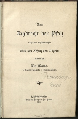 Das Jagdrecht der Pfalz nebst den Bestimmungen über den Schutz von Vögeln / erl. von Carl Maenner