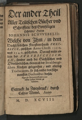 Der ... Theil || Aller Teutschen Bücher vnd Schriff-|| ten deß Gottseligen Lehrers || Herrn IOHANNIS SCHVVEBELII.|| - Welche von Jhm/ in dem || Hochl[oe]blichen Fürstenthum[m] ZWEY-||BRVCK, zwischen Anno Christi 1530.|| vnd 1540. geschriben ... ||