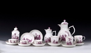 Service mit Genreszenen und Landschaften in Purpurmalerei