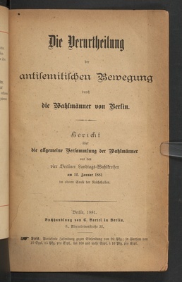 Die Verurtheilung der antisemitischen Bewegung durch die Wahlmänner von Berlin : Bericht über die allgemeine Versammlung der Wahlmänner aus den vier Berliner Landtags-Wahlkreisen am 12. Januar 1881 im oberen Saale der Reichshallen